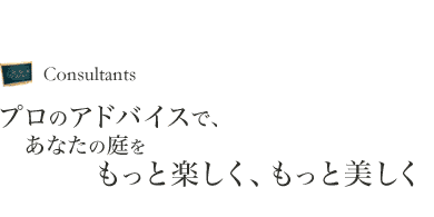 今あるお庭をもっときれいにしたい、デザインのアイディアがほしい、管理の仕方がわからない、そんな時にはプロのアドバイスをご活用ください。パブリックスペースとしての庭園のデザイン、運営についてのコンサルティングも承っております。